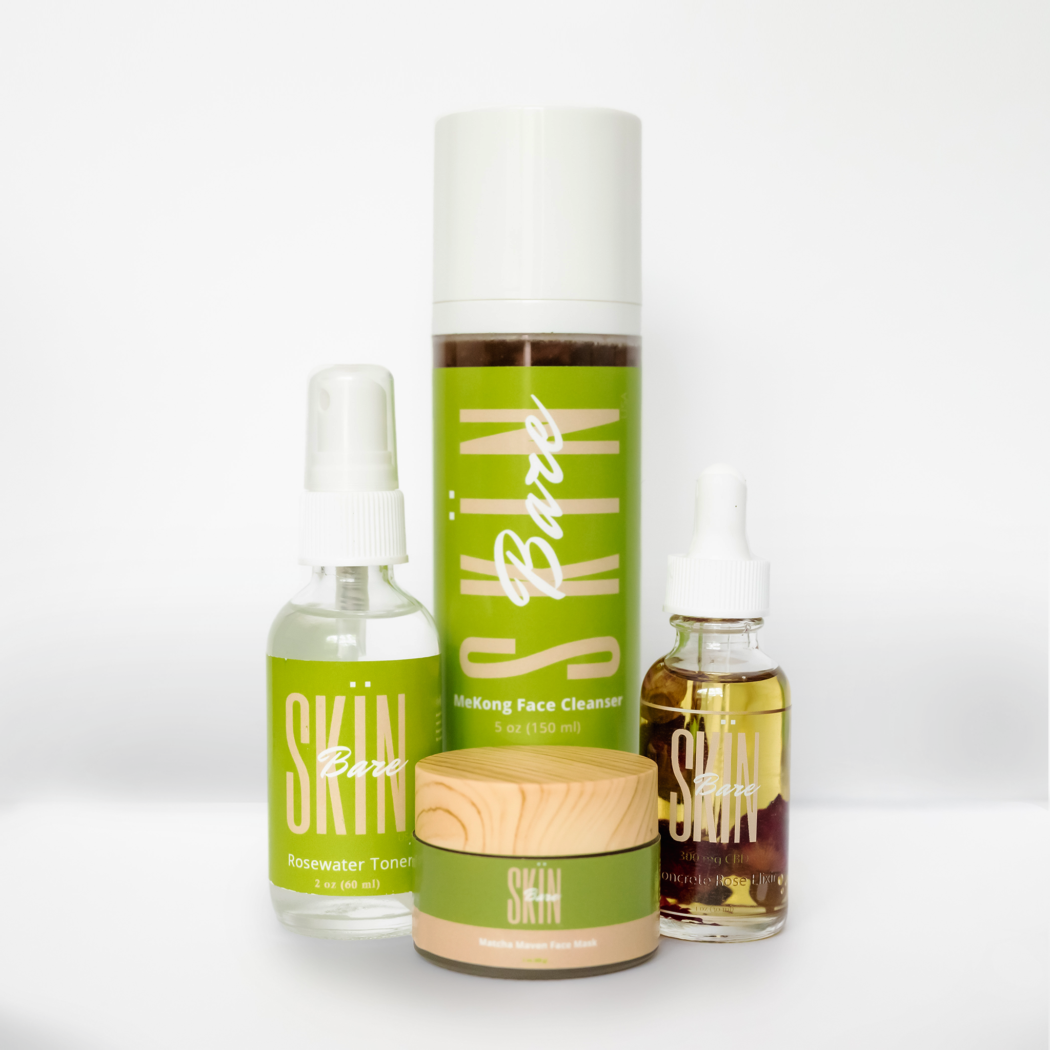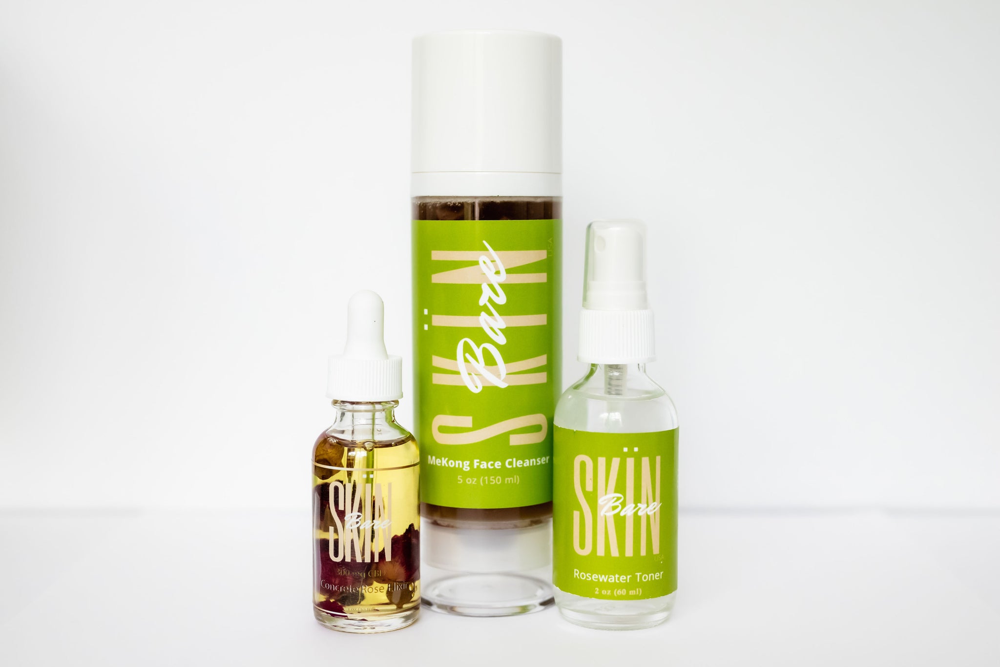 Our Bare Essential Box is all you need to get started with your BareSkin USA skincare routine. Our 3 step system starts with using our MeKong Cleanser, Rosewater Toner, and Concrete Rose Elixir packed in our bare essential box.
